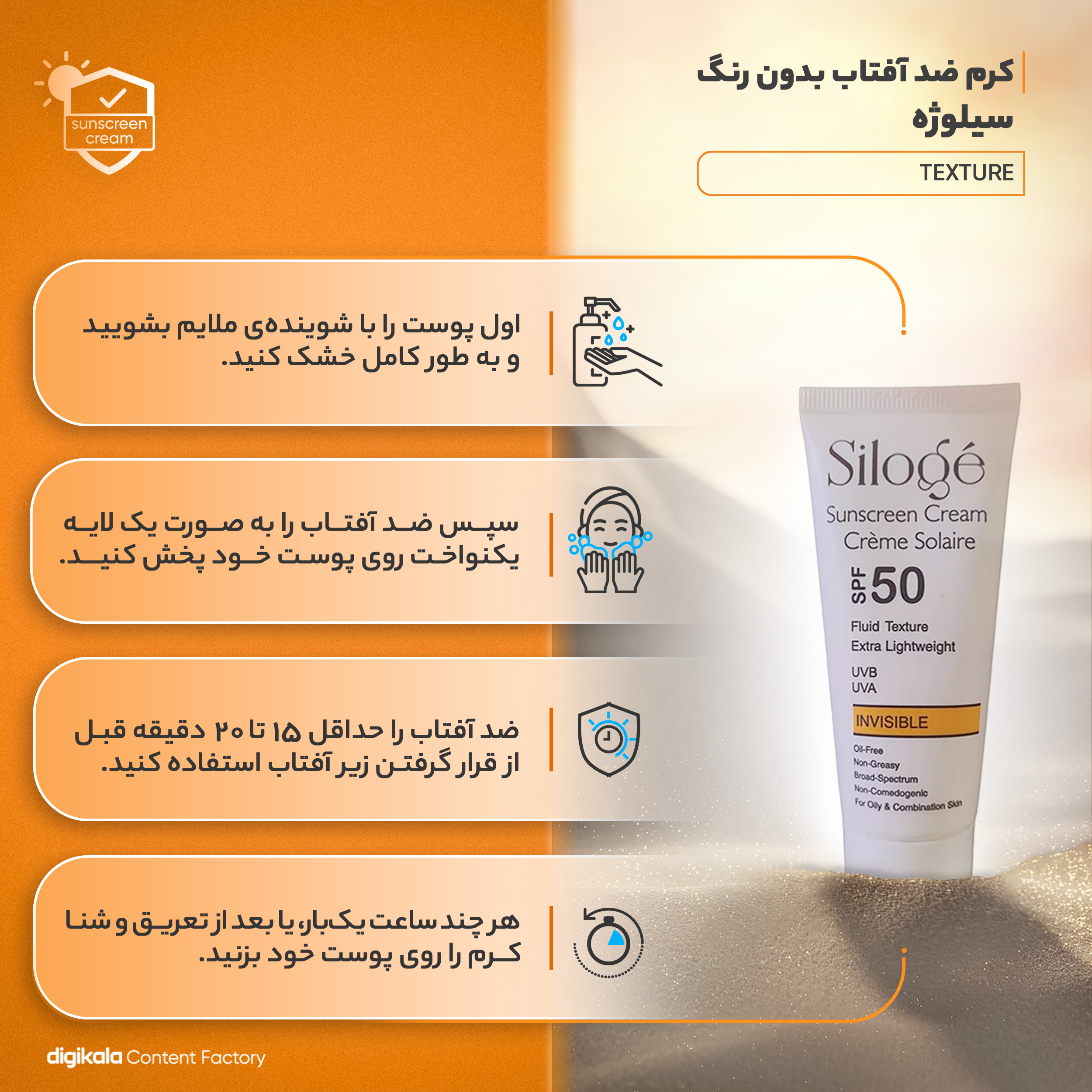 ۲۰ دقیقه قبل از قرار گرفتن در معرض آفتاب مقدار کافی از ضد آفتاب فلویید بی رنگ بدون چربی را روی پوست خود استفاده کنید.